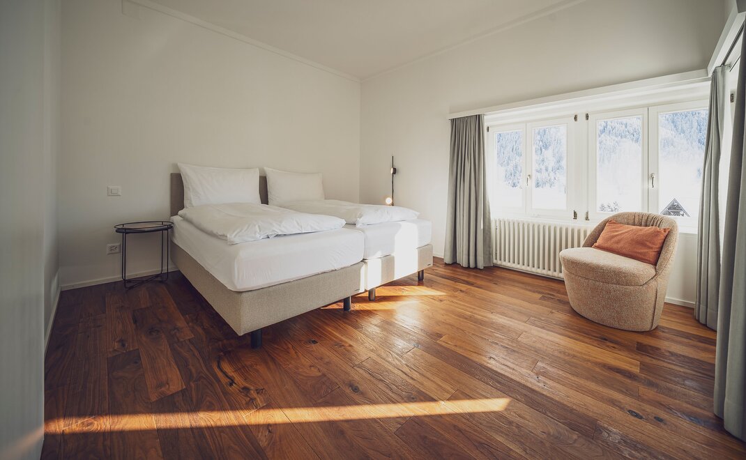 From the 14 to 17 square meter south-facing double room, guests can enjoy a fantastic view of the Jakobshorn. This can also be enjoyed from the private balcony. The rooms have a double bed (2 mattresses 90 x 200cm) and a private bathroom with WC and shower. Exclusive Soeder toiletries are also avaiable in the bathroom.