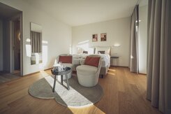 The suites at the Hotel Joseph's House promise extra comfort and space for two to four people. Equipped with a double bed (2 mattresses 90 x 200cm), a sofa an armchair and a table, they are the perfect choice for a relaxing stay. From the 28 square meter suite, guests have access to their own balcony, where a fantastic view of the mountains awaits. Exclusive Soeder toiletries are also avaivable in the bathroom.