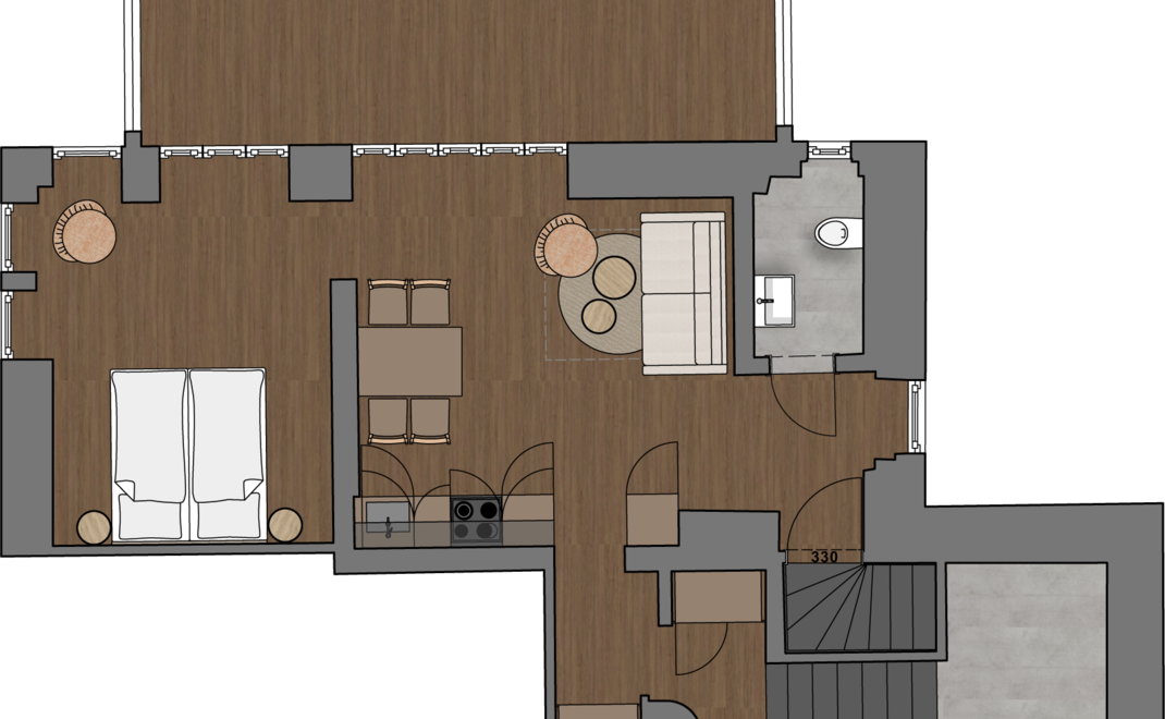 On the 4th floor of Joseph's House is the Senior Suite. The 60 square meter suite with a kitchen and washing machine/dryer is ideal for longer stays for up to four people. On the veranda or in the modern Senior Suite, couples, friends, or families can enjoy cozy evenings after eventful days.