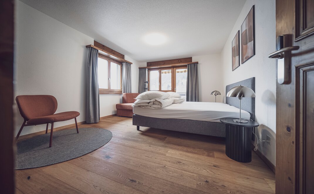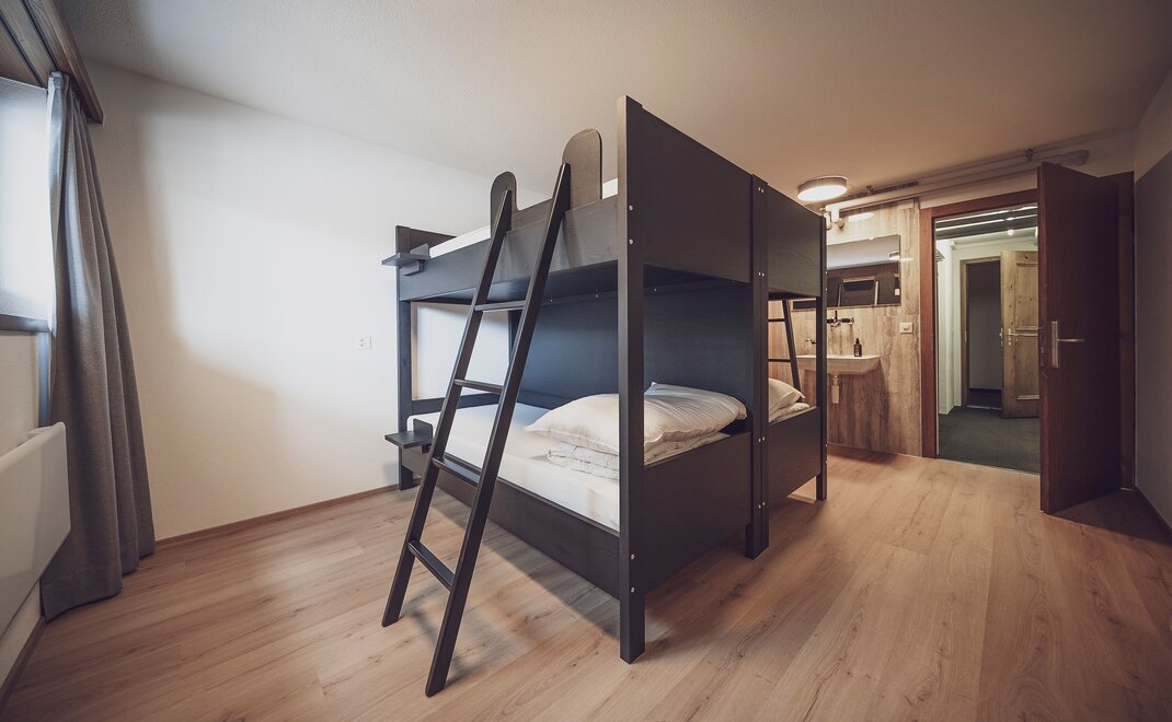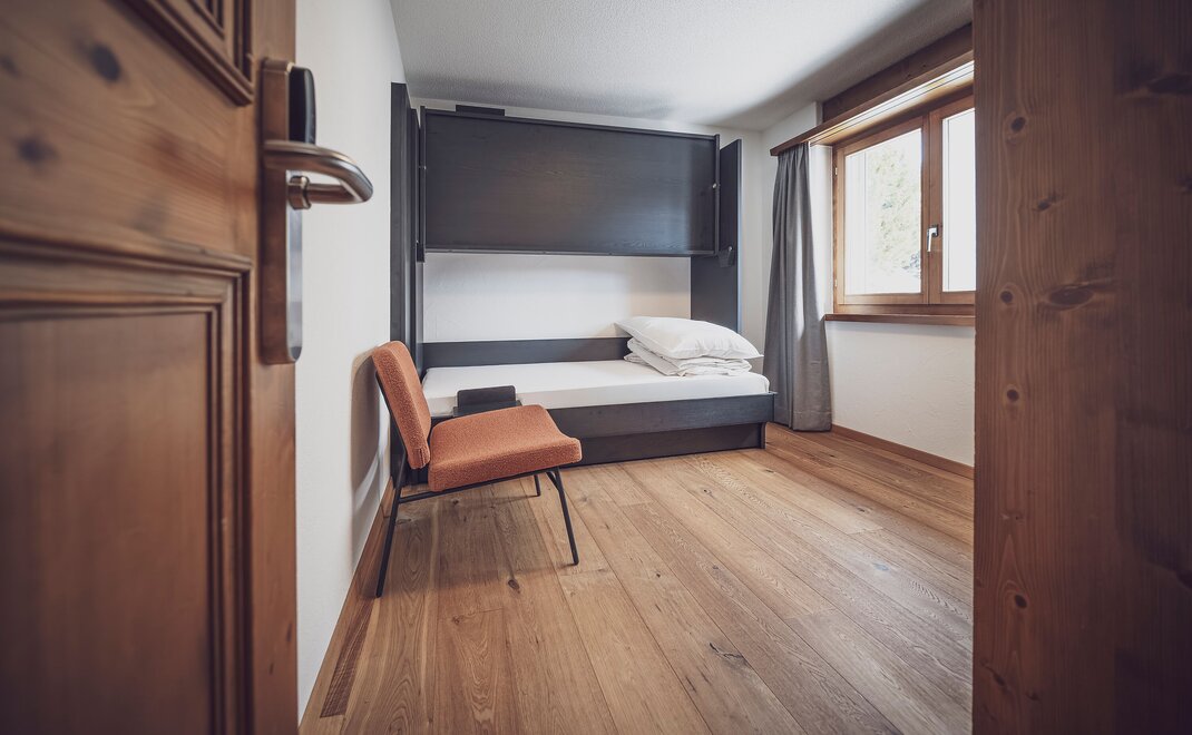 One of the highlights is the large rooftop terrace on two sides, with unobstructed views of the Jakobshorn and Tinzenhorn – the perfect spot for your first coffee in the morning or a relaxing after-work beer with a view. Guests sleep in a mix of double and single beds. The rooms are simple, newly furnished, and designed for groups. In winter, you can bring your skis with you – there is a ski room in the house.